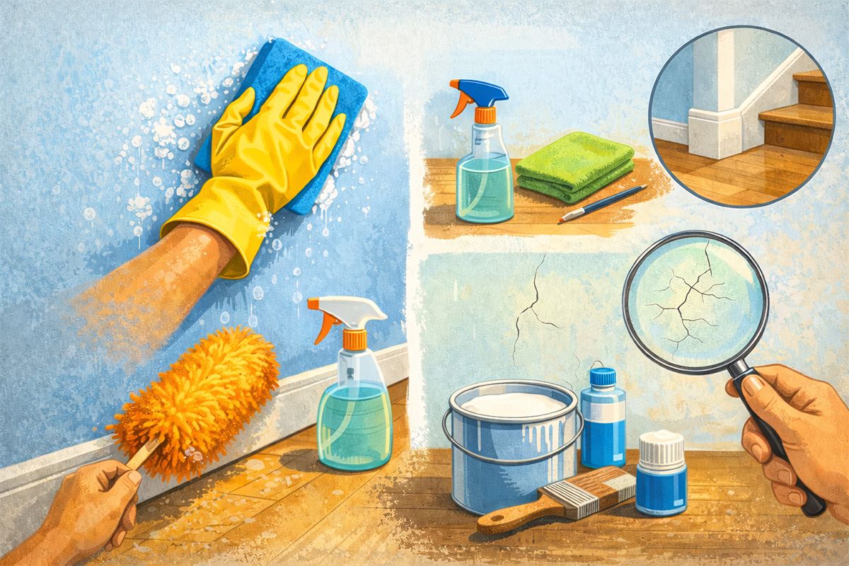 Évitez les produits chimiques agressifs et les éponges abrasives qui pourraient rayer ou dissoudre la peinture. Dans les zones à fort passage ou exposées aux éclaboussures, comme les cuisines et les couloirs, envisagez l’utilisation de peintures lessivables et/ou de vernis de protection lors de la rénovation pour faciliter l’entretien. Il est également recommandé de protéger les murs situés près des poignées de porte ou des angles avec des protections murales ou des plaques de propreté.